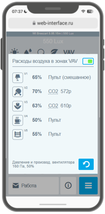 В режиме VAV в верхней части основного экрана появляется иконка «VAV», в поле «Скорость вентилятора» отображается буква «P» (если регулировка давления отключена), либо уровень давления в воздуховоде / распределительной камере.