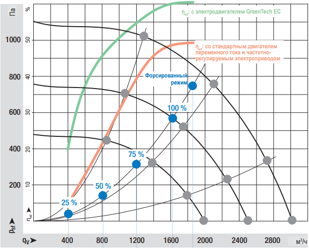 | Вентилятор со стандартным двигателем переменного тока с частотно-регулируемым электроприводом | Вентилятор с двигателем, выполненным по технологии EC | |