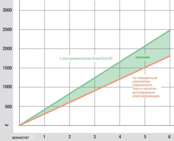EC-вентиляторы любого из представленных производителей плавно реагируют на изменение требований по выходной мощности, работают в особо экономном режиме частичной нагрузки и нечувствительны к колебаниям напряжения. EC-вентиляторы обеспечивают снижение до 30 % расхода электрической энергии в сравнении с обычными трехфазными AC-вентиляторами.