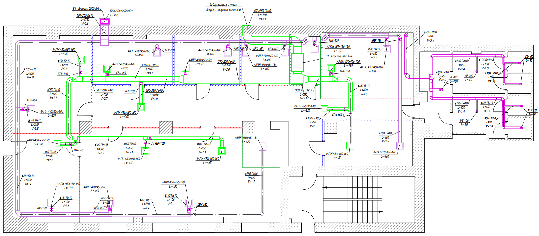 Удаление воздуха из помещений происходит через вытяжки с помощью вытяжной установки Breezart 2000 Extra.
