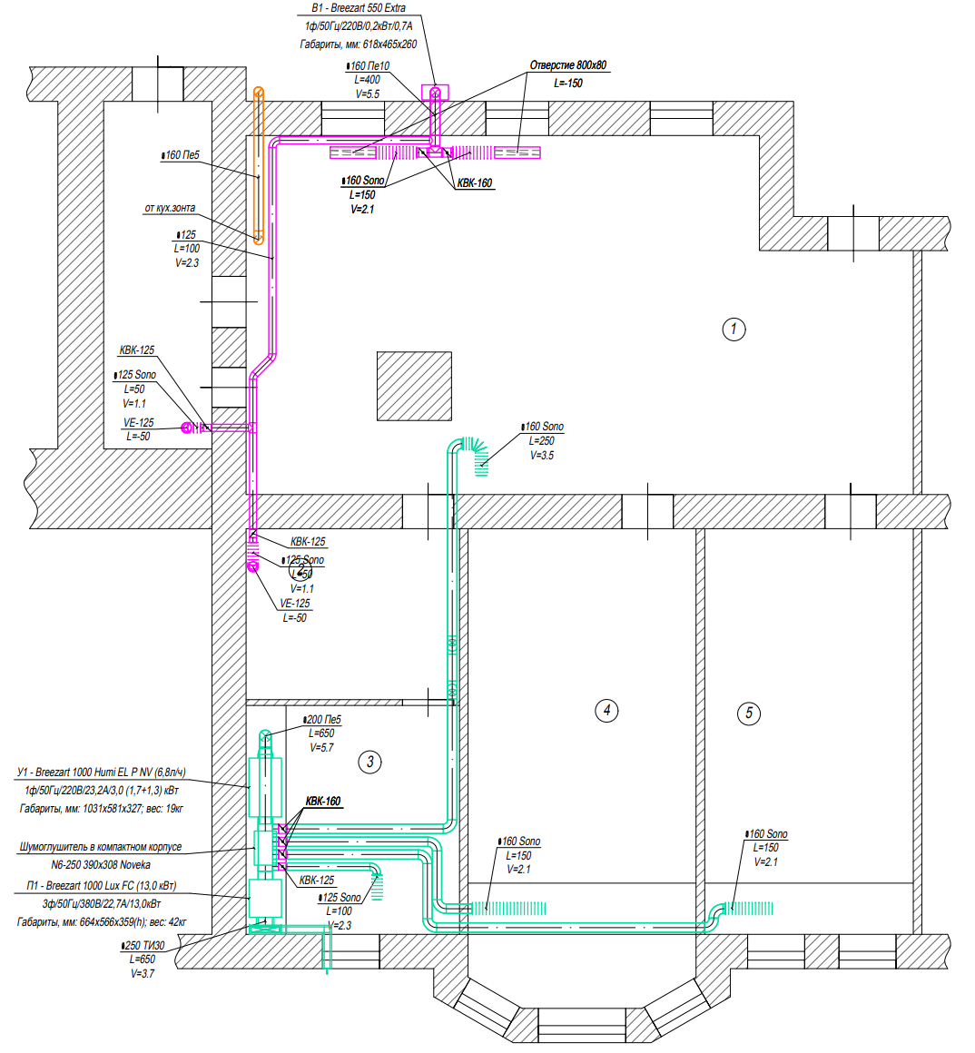 Удаление воздуха из помещений происходит через вытяжки с помощью вытяжной установки Breezart 550 Extra.
