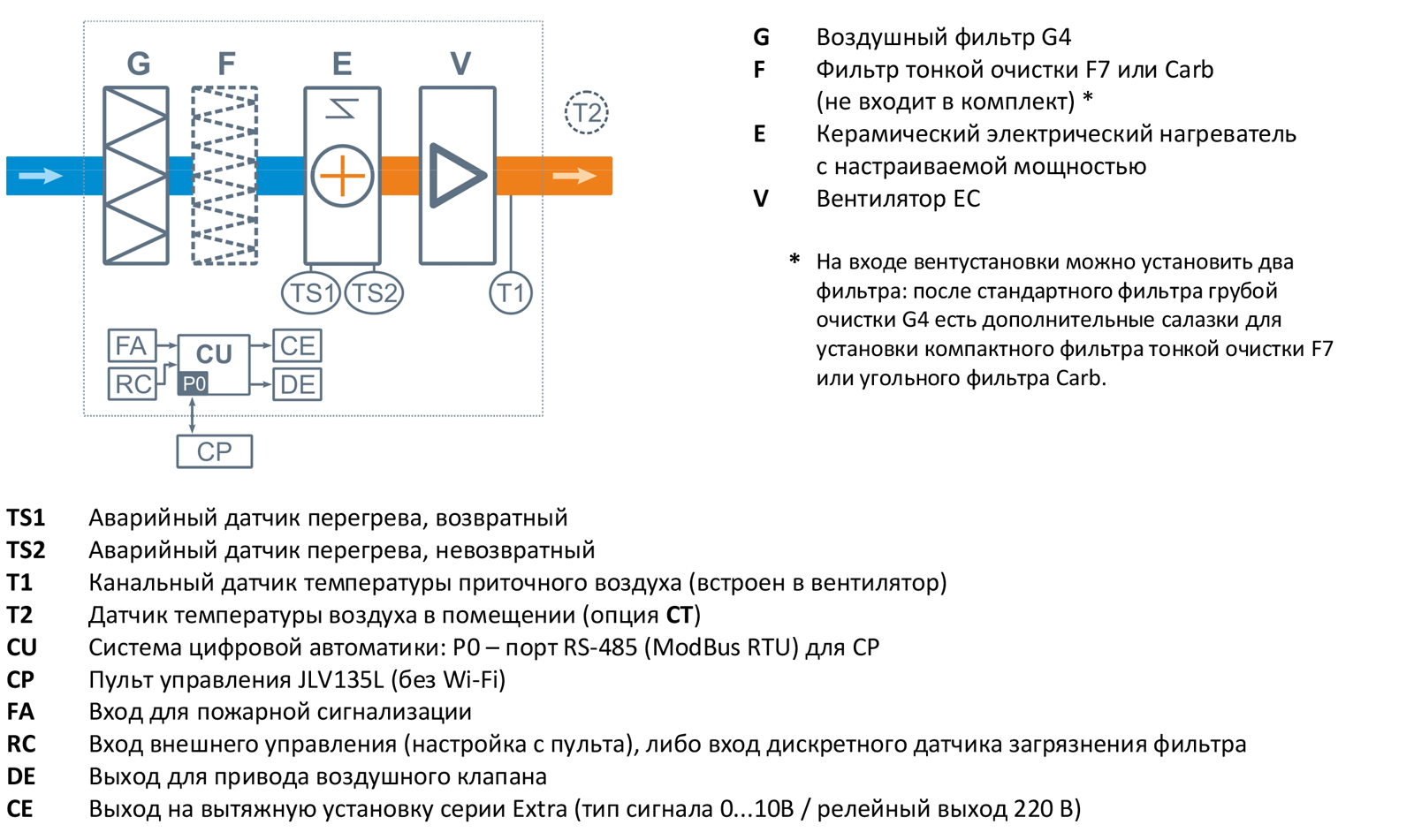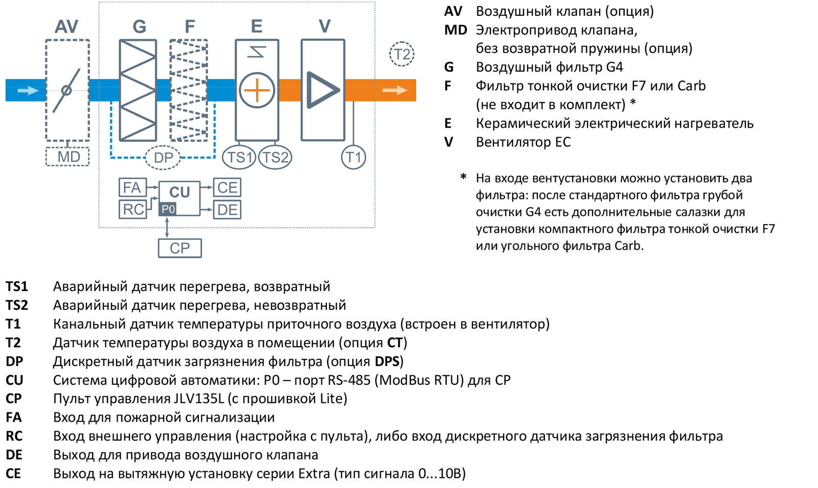 Она предназначена для создания простой системы вентиляции квартир, офисов и загородных домов, где не требуется зональная VAV-система вентиляции, увлажнение воздуха и удаленное управление приточной установкой.