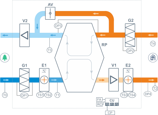 Приточно-вытяжные установки Breezart Lux RP оснащены системой защиты рекуператора от обмерзания при низких температурах наружного воздуха, а также системой экспресс разморозки рекуператора. Часть нагретого приточного воздуха через регулируемый клапан возвращается на вход приточного канала рекуператора, поддерживая температуру на его входе не ниже заданной (обычно -10...-15°С). При этом производительность вытяжного вентилятора уменьшается на определенную величину для компенсации снижения расхода воздуха приточного канала и поддержания заданного баланса притока-вытяжки. Если же из-за неблагоприятных внешних условий, например, повышенной влажности вытяжного воздуха, обмерзание все же произошло, то температура воздуха на входе приточного канала рекуператора увеличивается до +10 °С. В результате потоки теплого приточного и вытяжного воздуха растапливают лед внутри рекуператора за несколько минут (приточный канал не обмерзает, поэтому здесь сохраняется нормальная скорость потока).