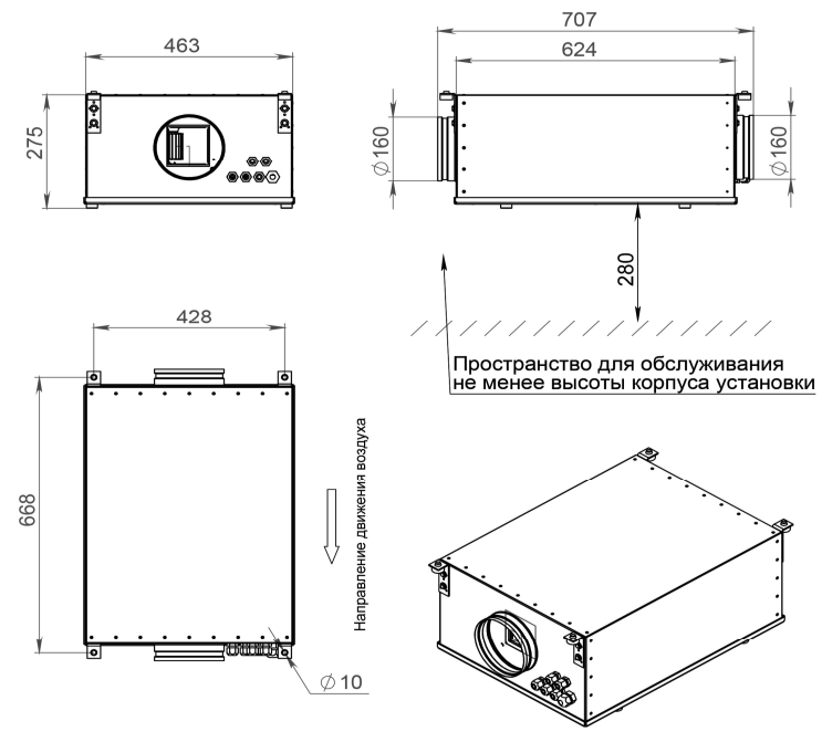 Для профилактической замены фильтра, обслуживания вентустановки и системы автоматики необходимо обеспечить свободный доступ к сервисным люкам и клеммной коробке, а также возможность полного демонтажа вентустановки в случае ее неисправности. Расстояние для обслуживания должно быть не менее ширины или высоты вентустановки, в зависимости от расположения сервисных люков, по всей их длине. Дополнительно необходимо предусмотреть беспрепятственный доступ к навесному оборудованию, такому как смесительные узлы, электроприводы и т.п.