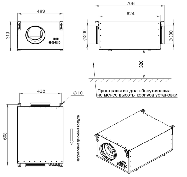 Для профилактической замены фильтра, обслуживания вентустановки и системы автоматики необходимо обеспечить свободный доступ к сервисным люкам и клеммной коробке, а также возможность полного демонтажа вентустановки в случае ее неисправности. Расстояние для обслуживания должно быть не менее ширины или высоты вентустановки, в зависимости от расположения сервисных люков, по всей их длине. Дополнительно необходимо предусмотреть беспрепятственный доступ к навесному оборудованию, такому как смесительные узлы, электроприводы и т.п.